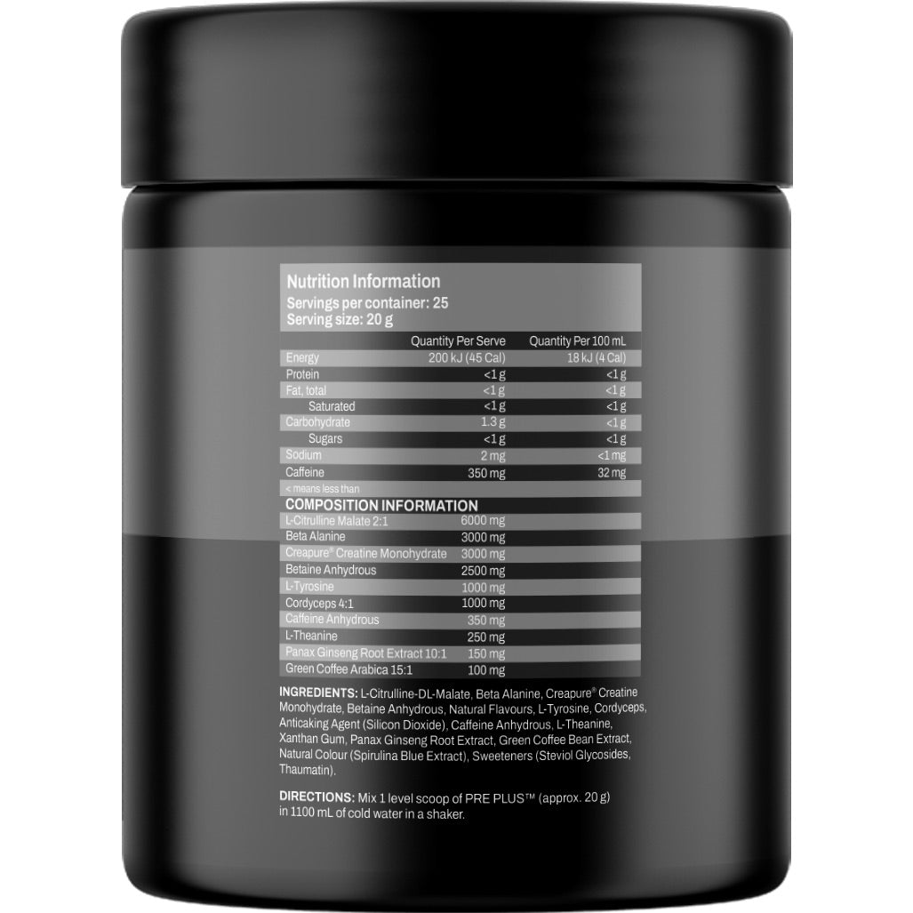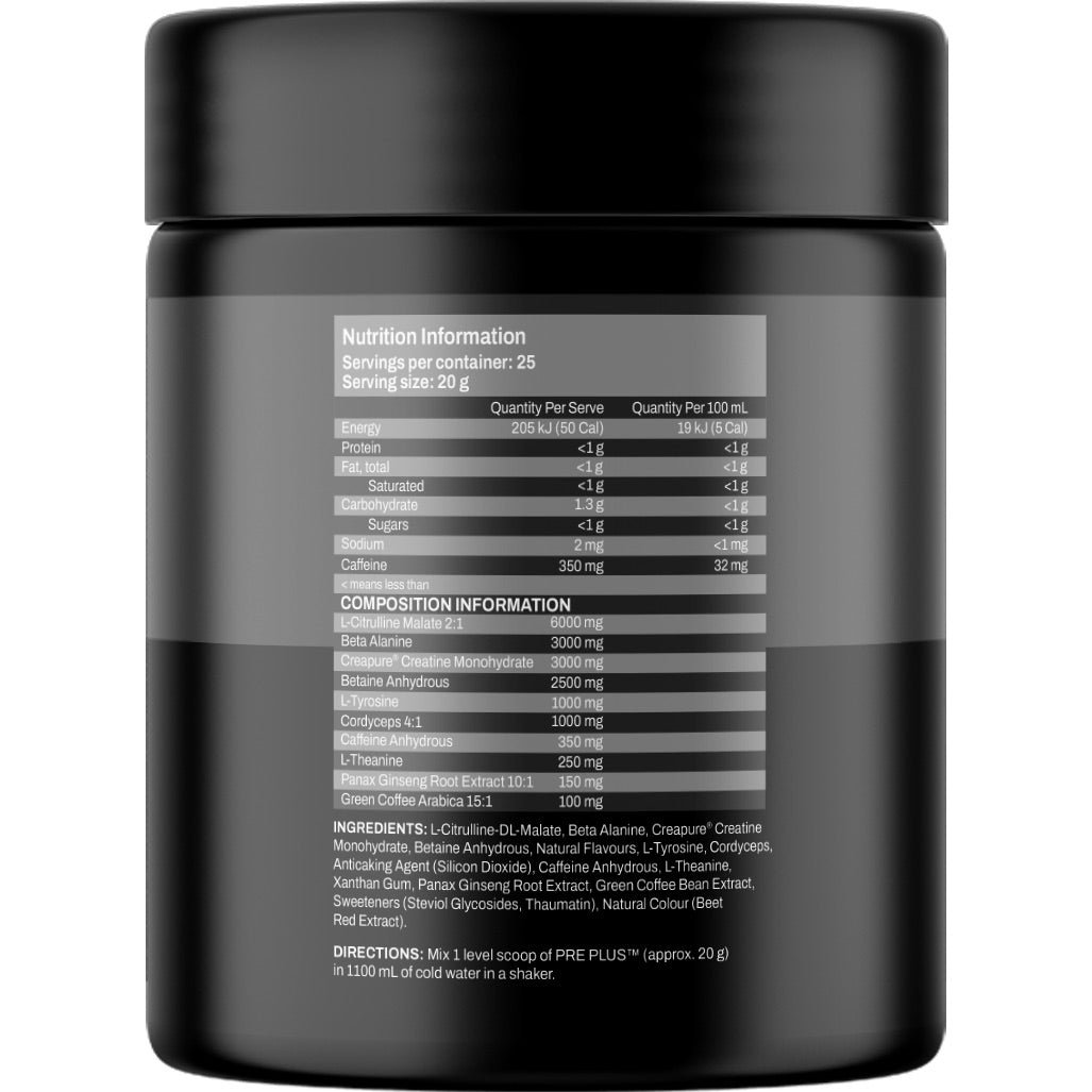 Pre Plus™ is built for athletes who demand more, delivering a high-performance edge with 350mg Caffeine Anhydrous, 3000mg Creapure® Creatine Monohydrate and 6000mg L-Citrulline Malate per serve. This potent formula helps reduce muscle fatigue, boost blood flow, and drive serious power.