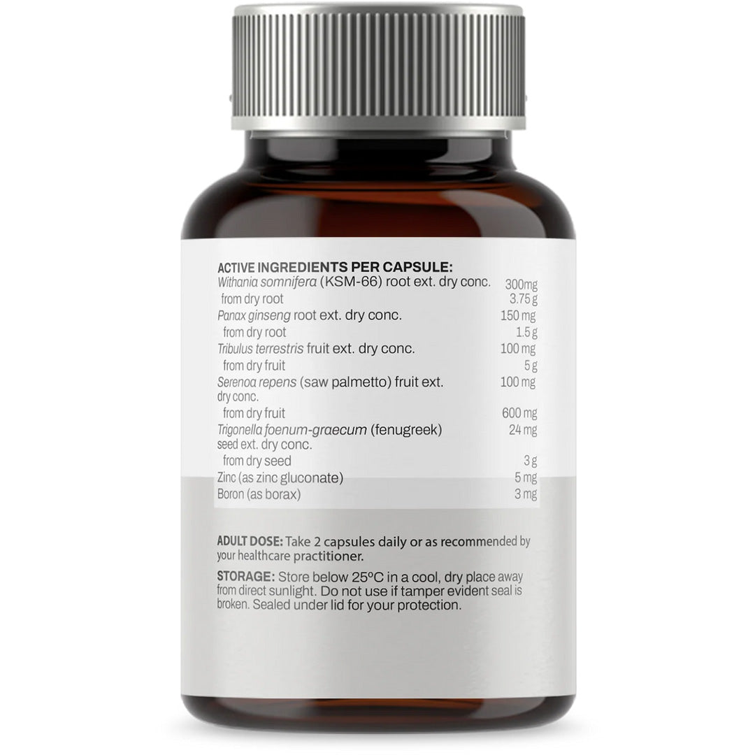 Withania somnifera (KSM-66), Panax ginseng root, Tribulus terrestris fruit, Serenoa repens (saw palmetto) fruit, Trigonella foenum-graecum (fenugreek) seed, Zinc (as zinc gluconate), Boron (as borax).