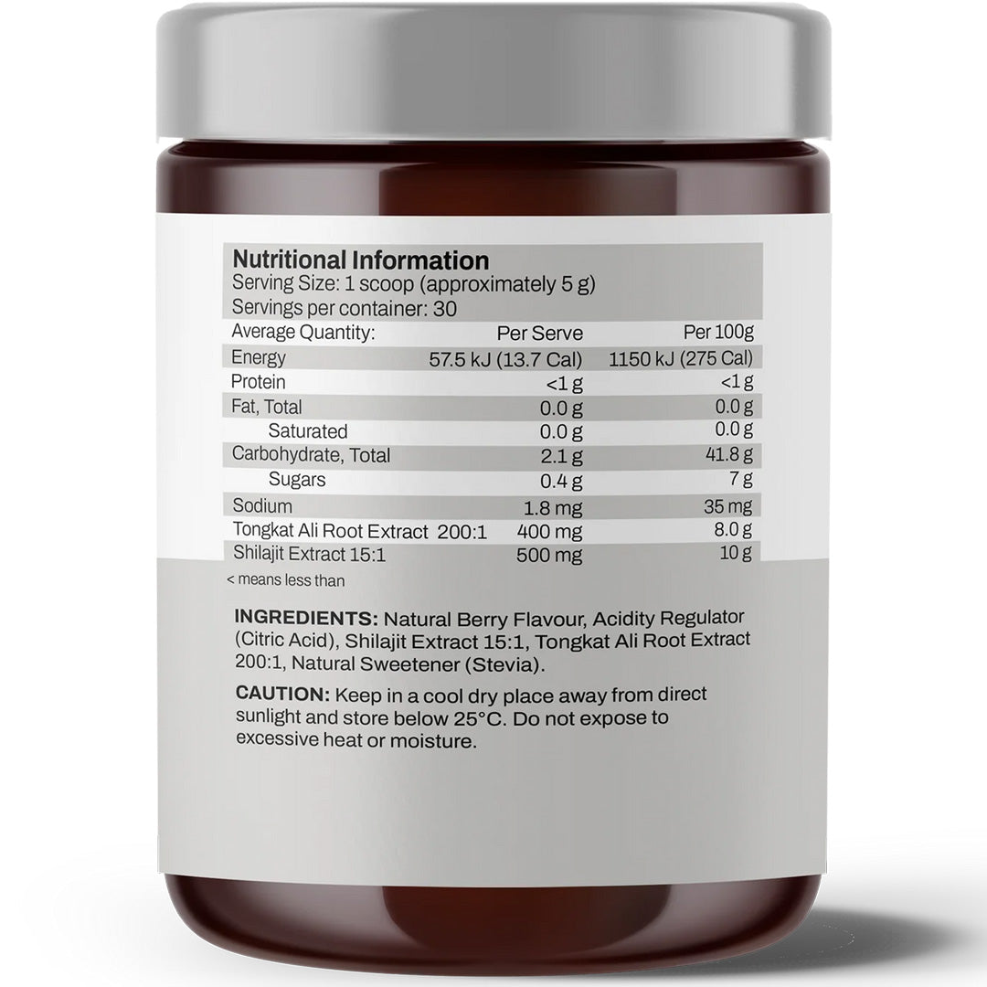 Natural Berry Flavour, Acidity Regulator (Citric Acid), Shilajit Extract 15:1, Tongkat Ali Root Extract 200:1, Natural Sweetener (Stevia).