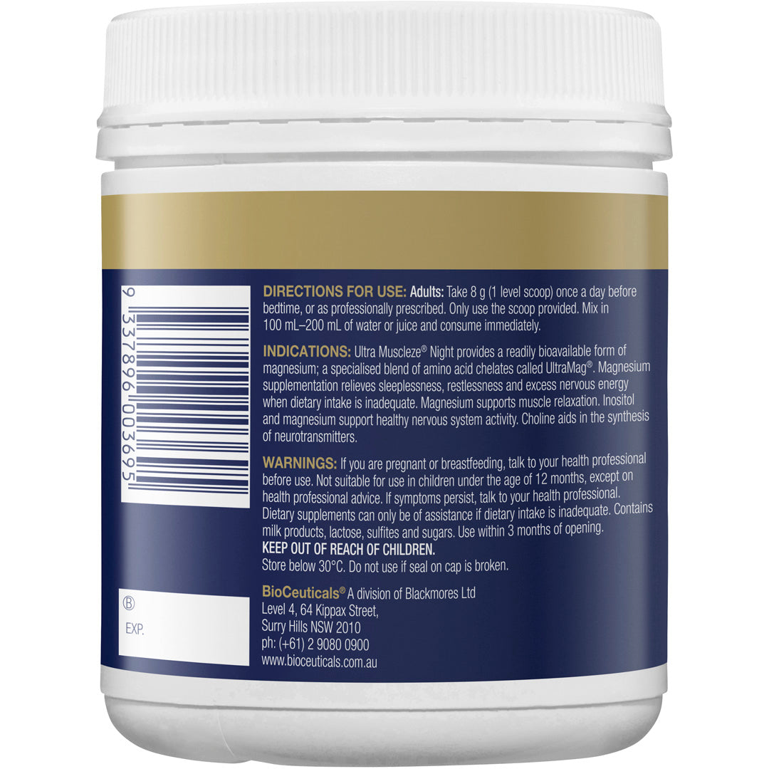 Ultra Muscleze® Night provides a readily bioavailable form of magnesium; a specialised blend of amino acid chelates called UltraMag®. Magnesium supplementation relieves sleeplessness, restlessness and excess nervous energy when dietary intake is inadequate. Inositol and magnesium support healthy nervous system activity. Choline aids in the synthesis of neurotransmitters.