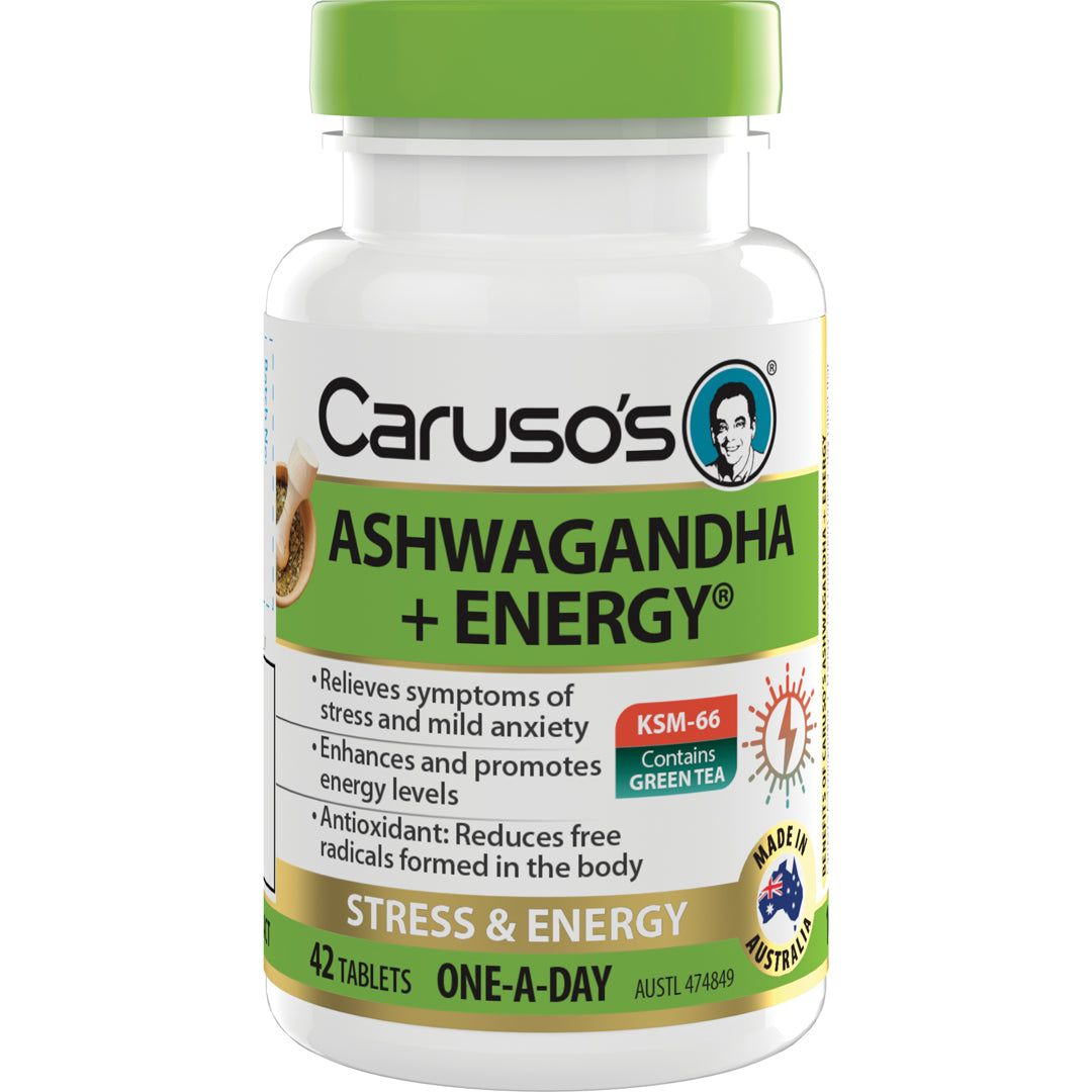Caruso's Ashwagandha + Energy® is a convenient one-a-day tablet that combines the calming benefits of Ashwagandha with the energy boost of Green Tea. Featuring KSM-66 Ashwagandha®, a certified organic, full-spectrum root extract, and Green Tea, a rich source of natural caffeine, this formula helps relieve stress and mild anxiety while enhancing energy levels.
