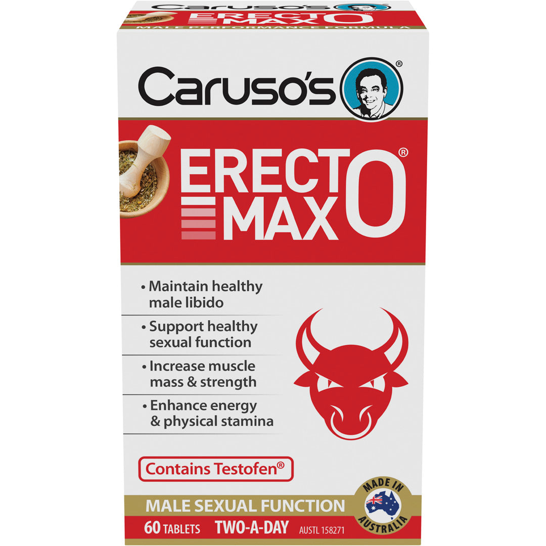 Caruso's ErectOmax is a herbal and nutritional preparation for men which has specifically been developed to support healthy testosterone levels and sexual function in healthy males, as well as helping to maintain a healthy libido in healthy males. Caruso's ErectOmax also helps to improve energy levels and stamina, assisting with muscle strength and muscle performance.