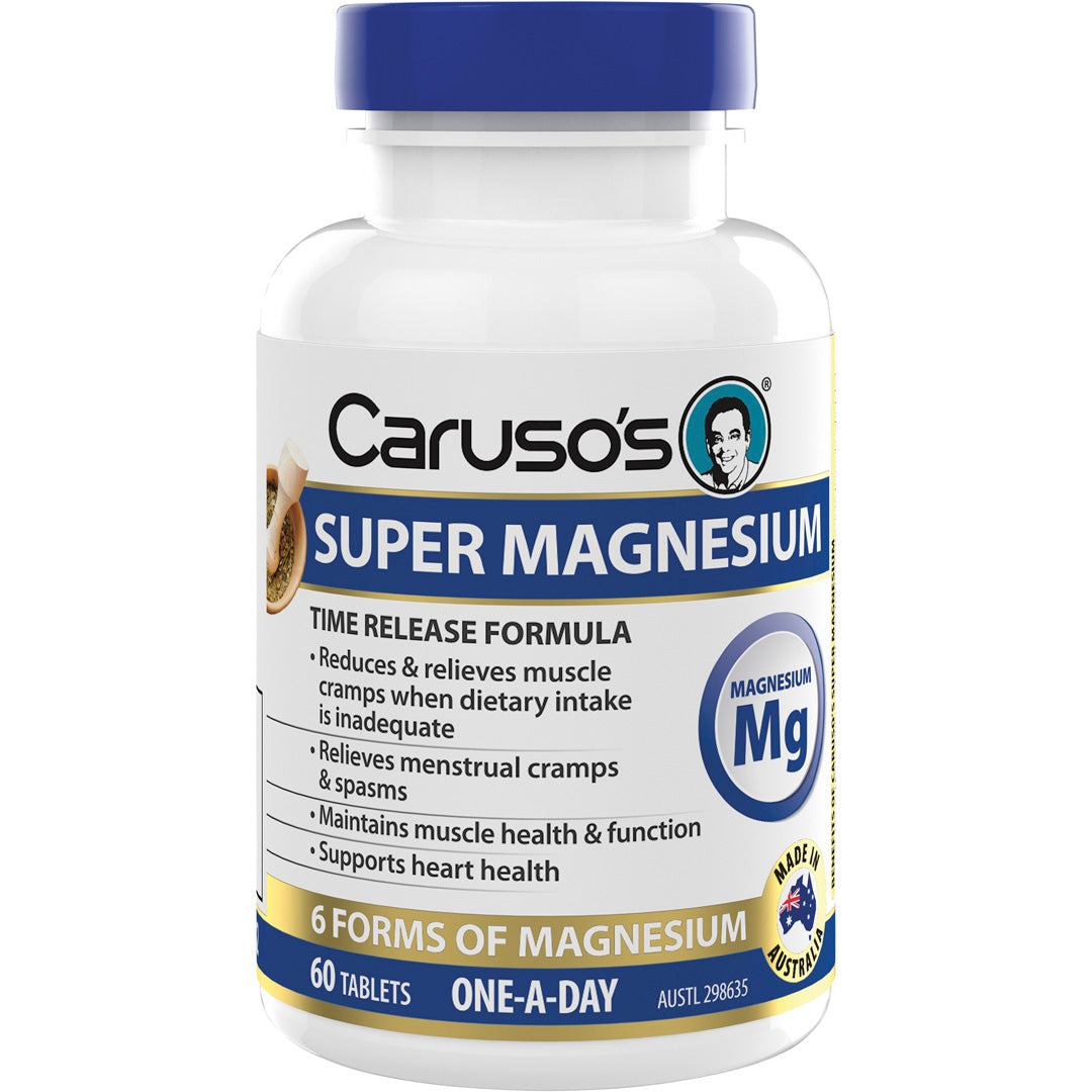 Caruso’s Super Magnesium is a broad-spectrum magnesium formula which helps reduce and relieve muscle cramps and mild muscle spasms when dietary intake is inadequate. It also helps relieve period cramps. Magnesium supports heart and muscle health and healthy cardiovascular system function. Magnesium also maintains the health and function of the nervous system and supports a healthy stress response in the body. Caruso’s Super Magnesium combines 6 different forms of magnesium in a convenient one-a-day 300mg, time release tablet.
