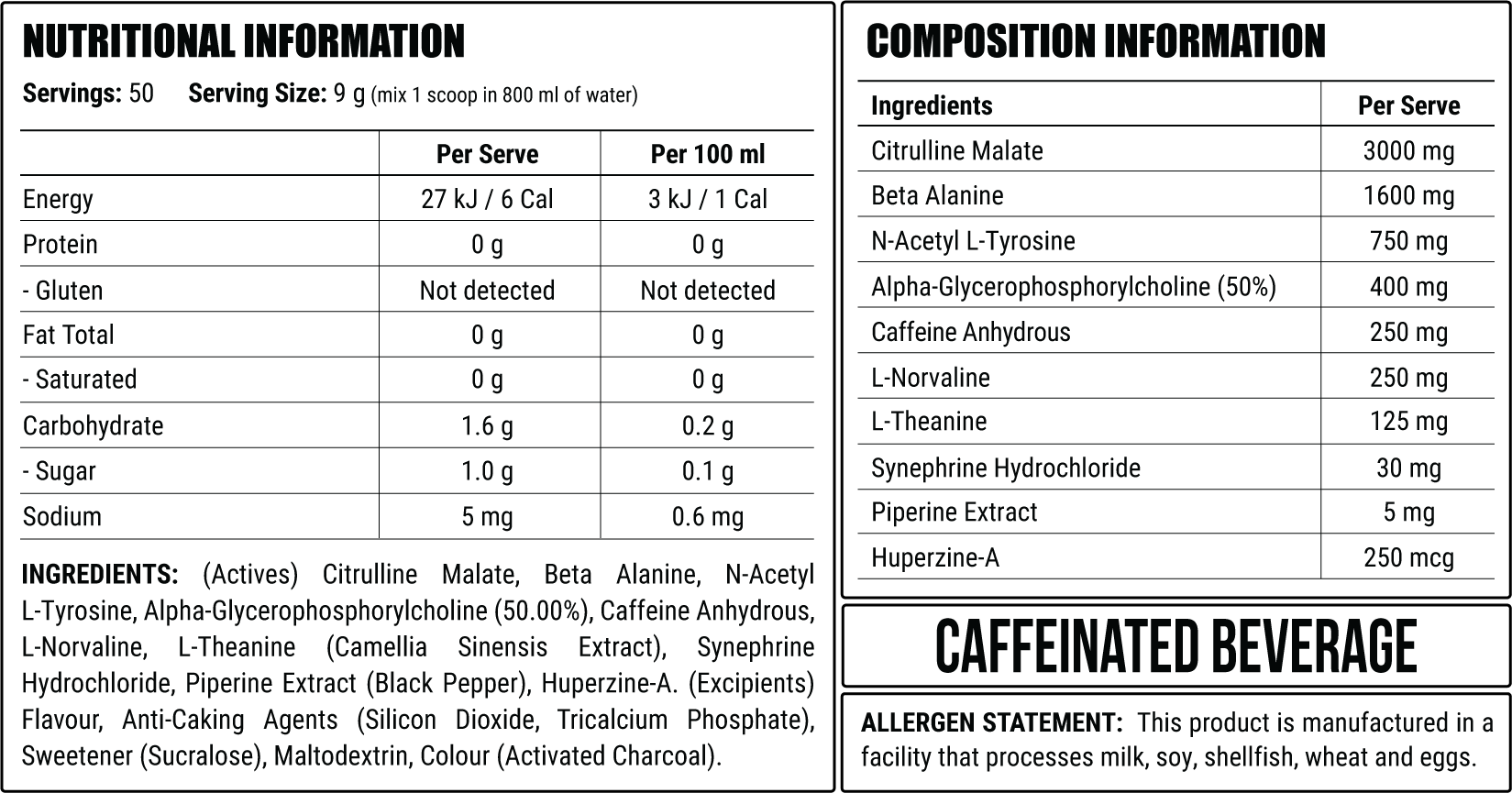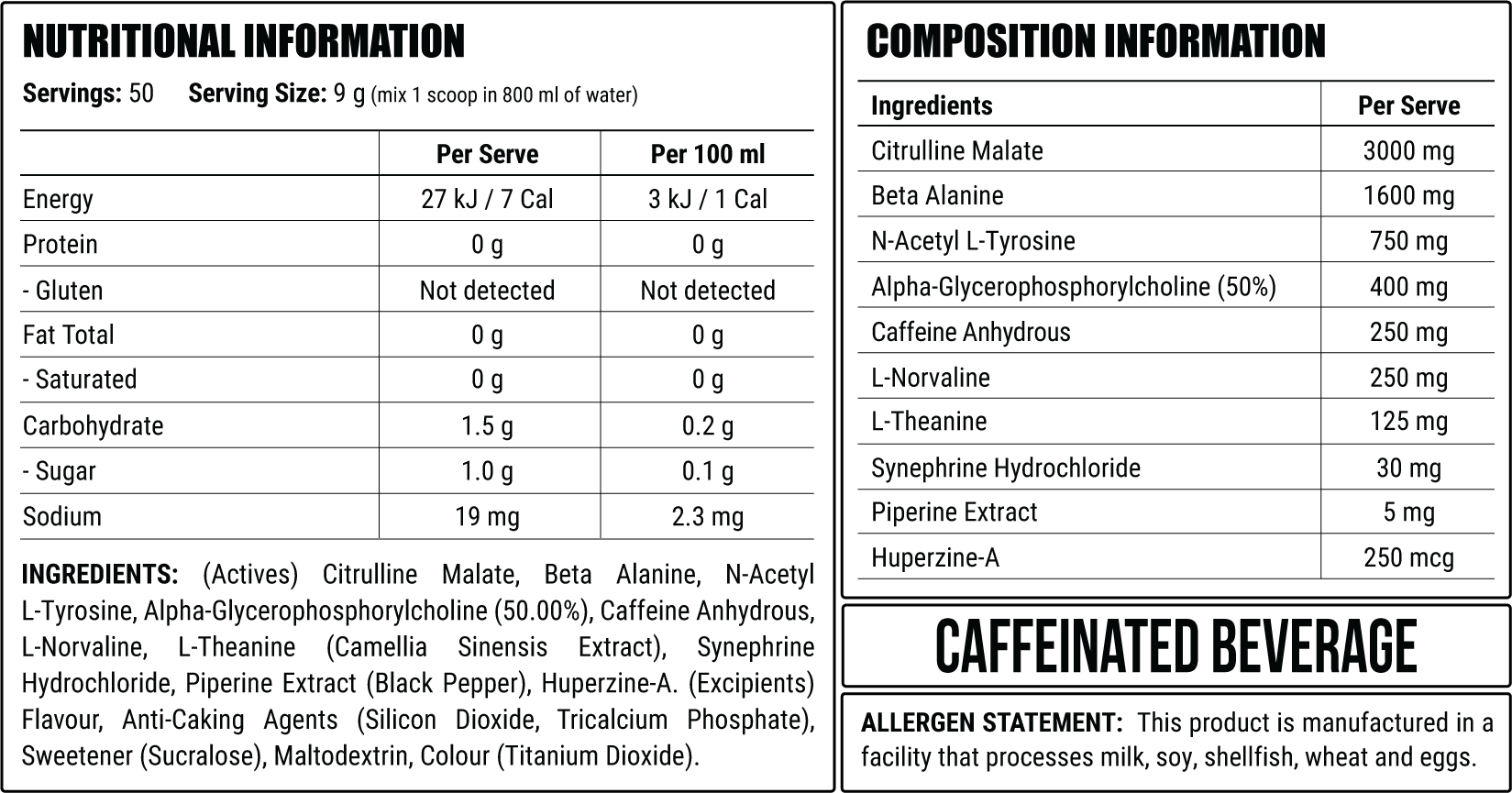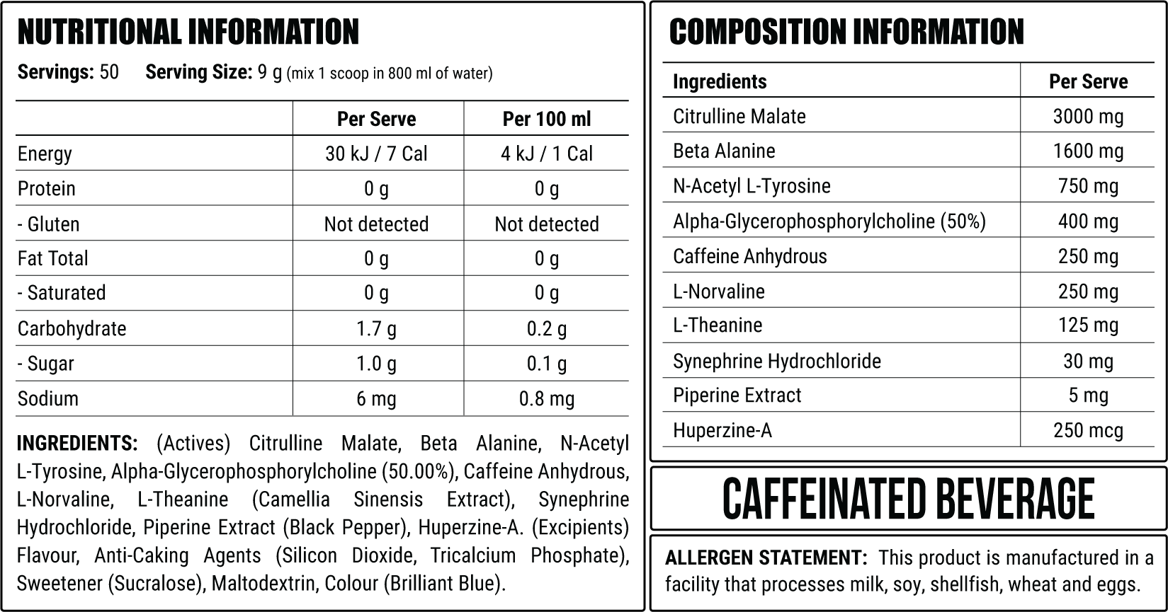 Mix 1 scoop in 800ml of chilled water. Consume 15-20 minutes before training. Do not consume powder or more than 1 serving per day. Store in a cool, dry place below 30 degrees Celsius. Do not expose to excessive heat or moisture.