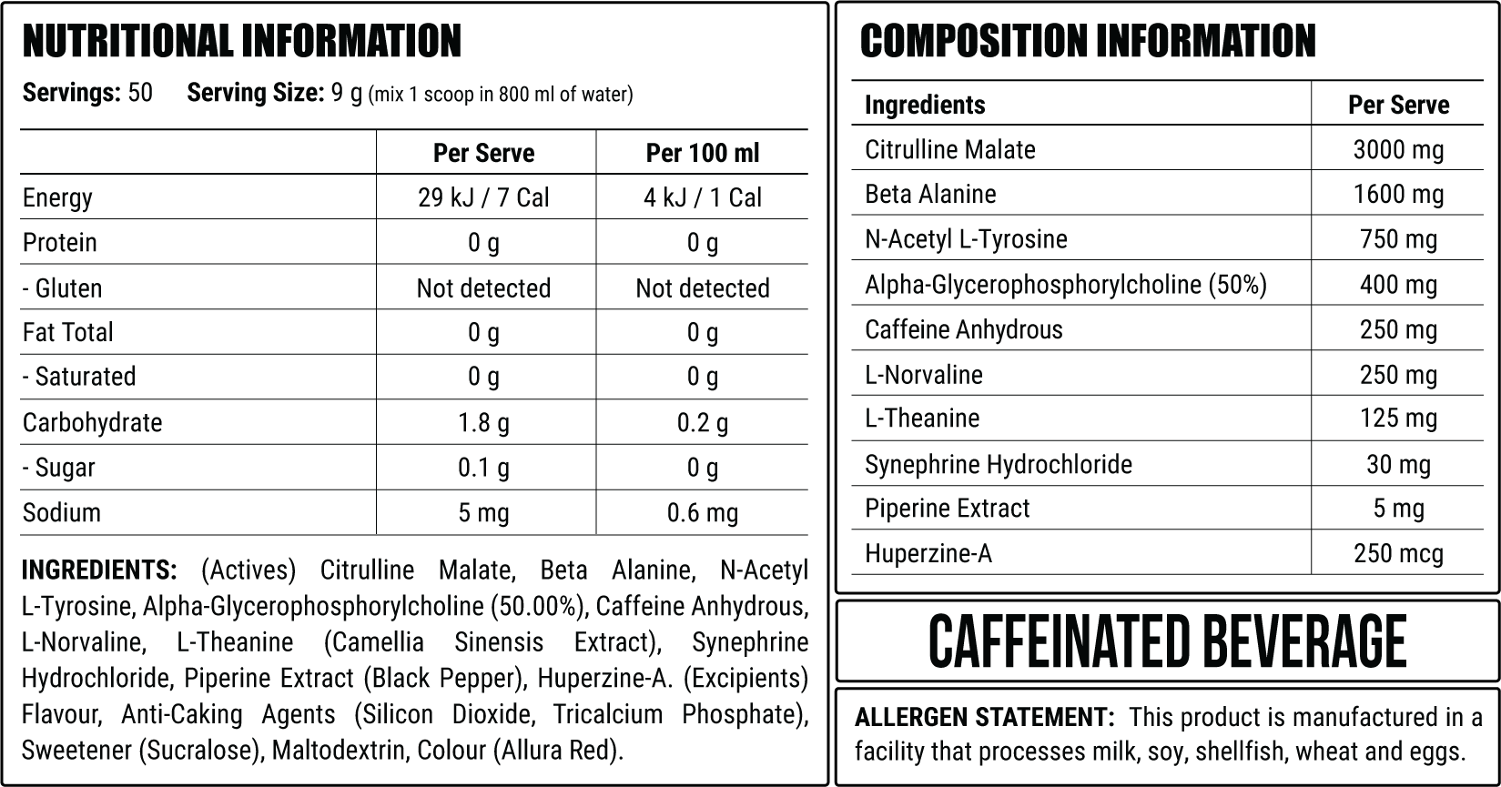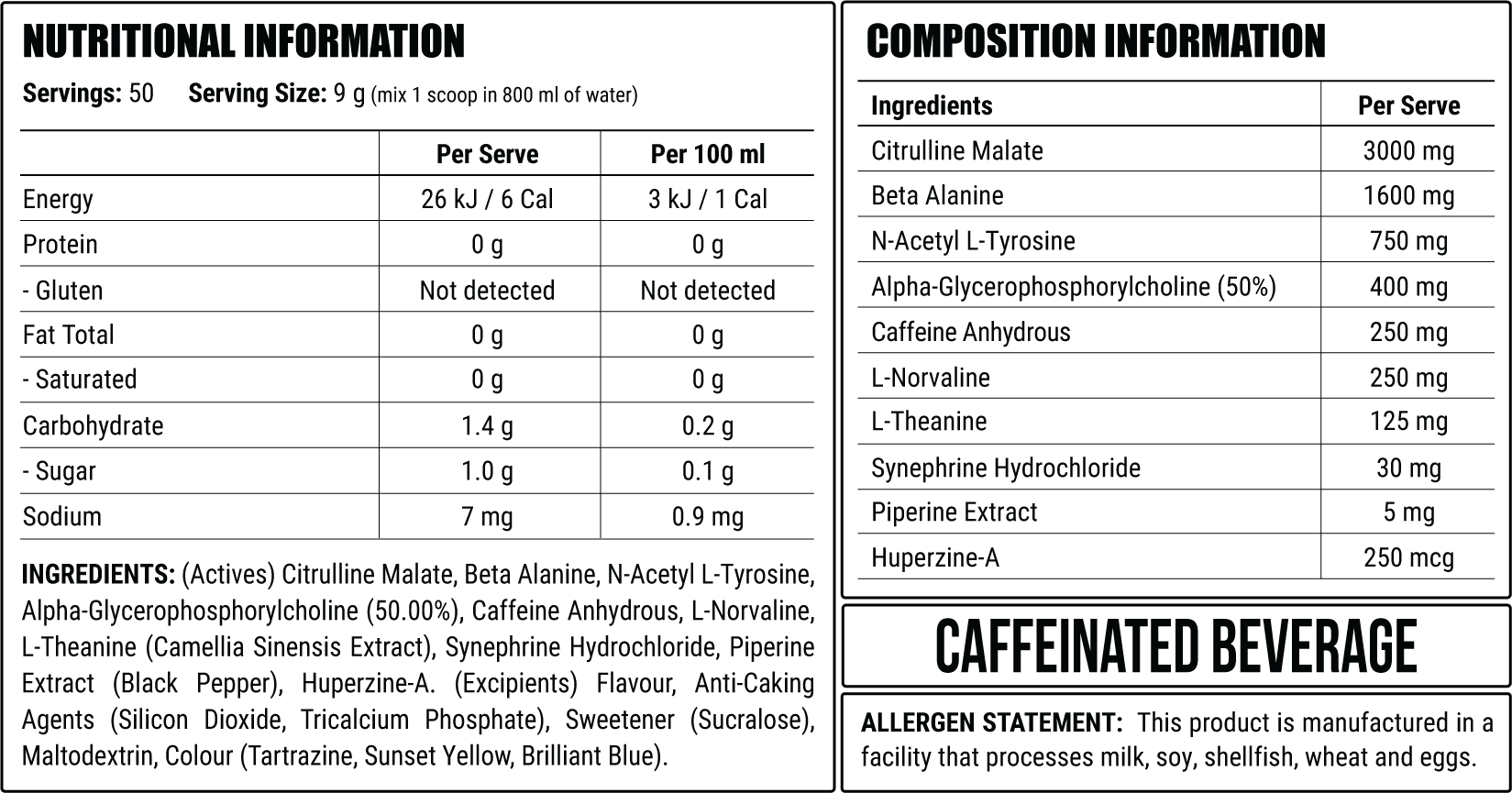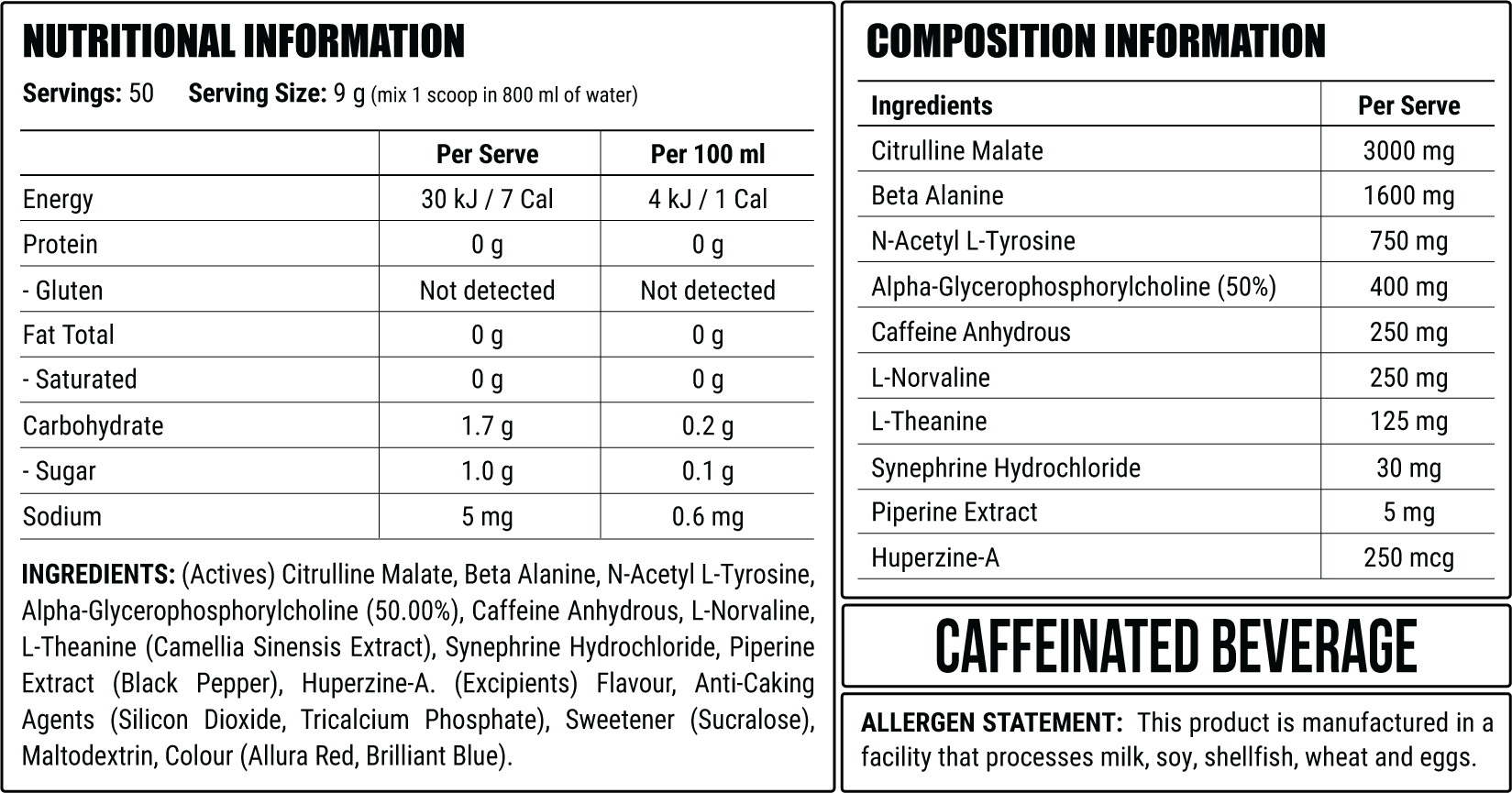 Mix 1 scoop in 800ml of chilled water. Consume 15-20 minutes before training. Do not consume powder or more than 1 serving per day. Store in a cool, dry place below 30 degrees Celsius. Do not expose to excessive heat or moisture.