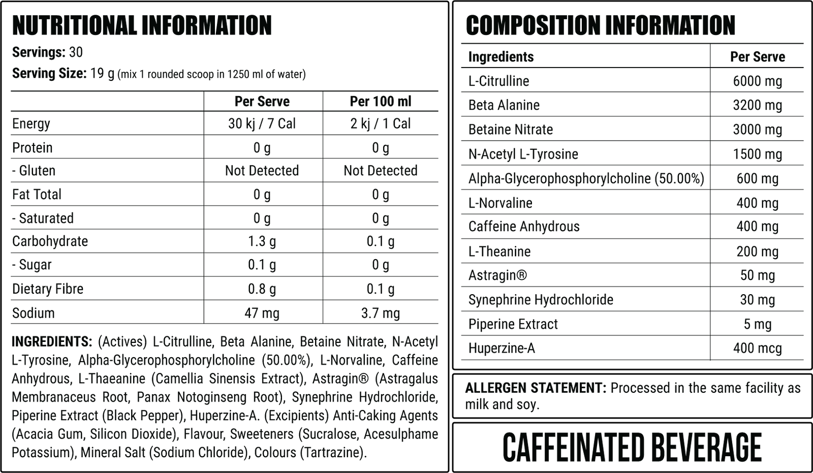 Mix 1 scoop in 800ml of chilled water. Consume 15-20 minutes before training. Do not consume powder or more than 1 serving per day. Store in a cool, dry place below 30 degrees Celsius. Do not expose to excessive heat or moisture.
