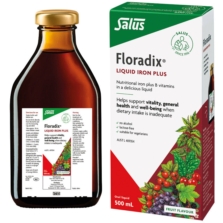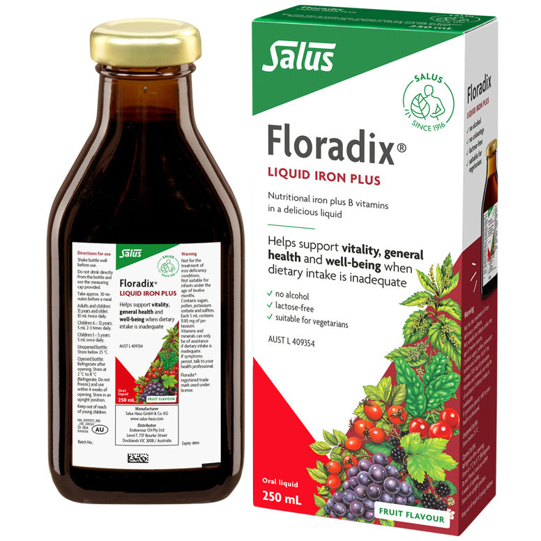 Iron is needed to produce haemoglobin which transports oxygen throughout the body. An iron deficiency can mean that you aren’t able to produce enough oxygen-carrying red blood cells. Taking an iron supplement like Floradix® Liquid Iron Plus can maintain iron levels in the body, maintaining energy, vitality and general well-being.