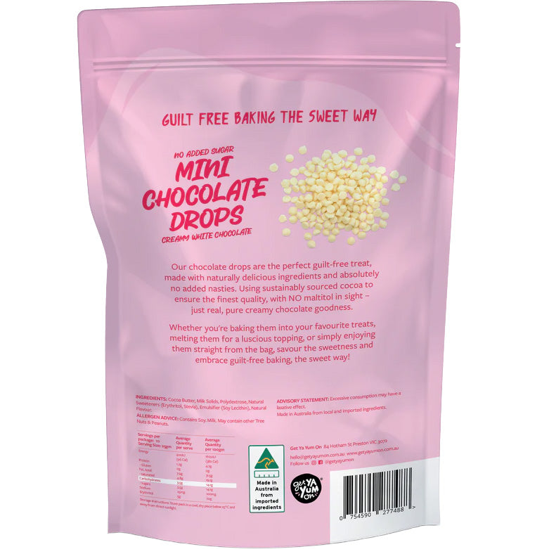 Our Sugar Free Mini White Chocolate Drops are the perfect guilt-free treat, made with REAL creamy white chocolate with absolutely NO ADDED NASTIES. Using sustainably sourced cocoa to ensure the finest quality with NO Maltitol in sight and no weird aftertaste! Whether you're baking them into your favourite treats, melting them for a luscious topping or simply enjoying them straight from the bag savour the sweetness and embrace guilt-free baking the sweet way!