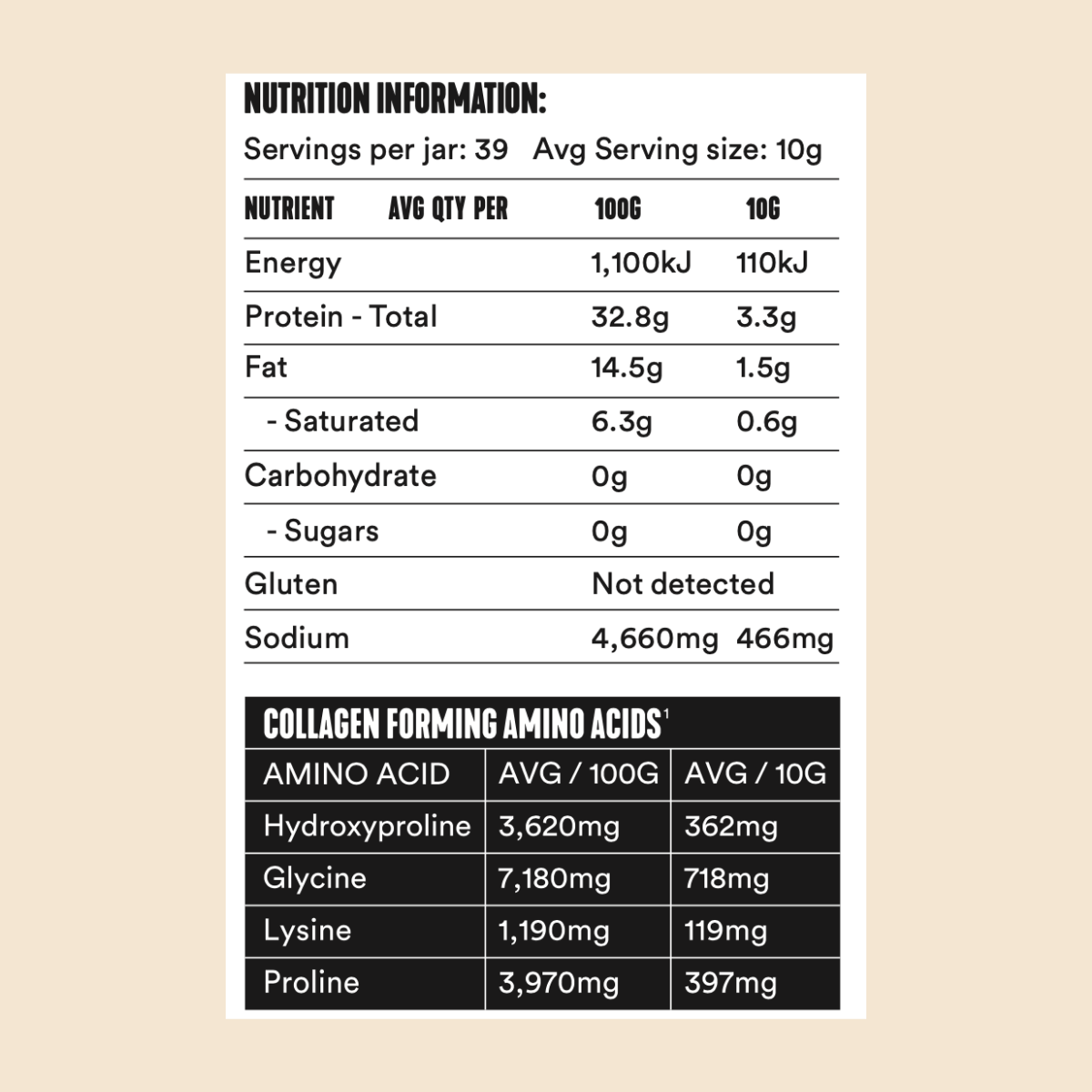 Our Natural Bone Broth Body Glue™ is made using just 2 ingredients - 100% grass-fed Australian beef bones and naturally evaporated sea salt, making it easy to digest and perfect for those with sensitive stomachs or allergies.