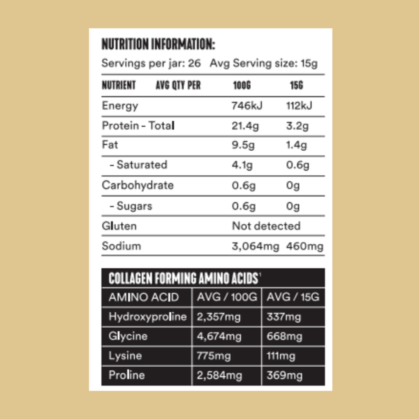 100% Grass-Fed Beef Bones (60%), Fire Tonic (30%) (Aged Raw Unfiltered Apple Cider Vinegar, Raw Honey, Chillies, Turmeric, Garlic, Horseradish, Ginger, Carrot, Celery, Red Onion, Brown Onion, Apple, Orange, Lemon, Brown Mustard Seed, Parsley, Rosemary, Oregano, Thyme, Juniper Berries, Black Peppercorns, Bay Leaves, Szechuan Pepper, Himalayan Salt), Naturally Evaporated Sea Salt, Turmeric, Ginger, Black Pepper, Lemon Myrtle