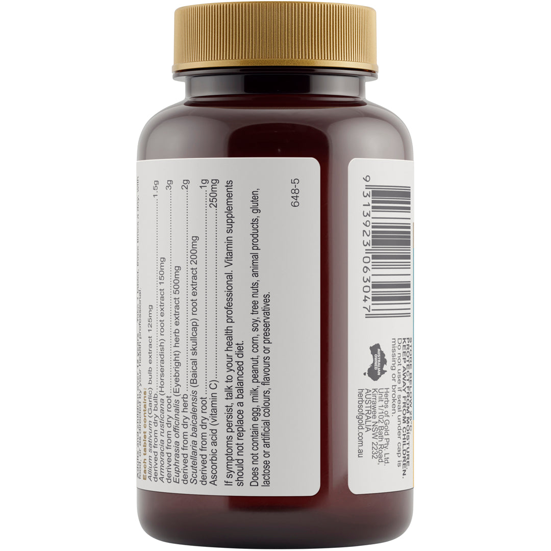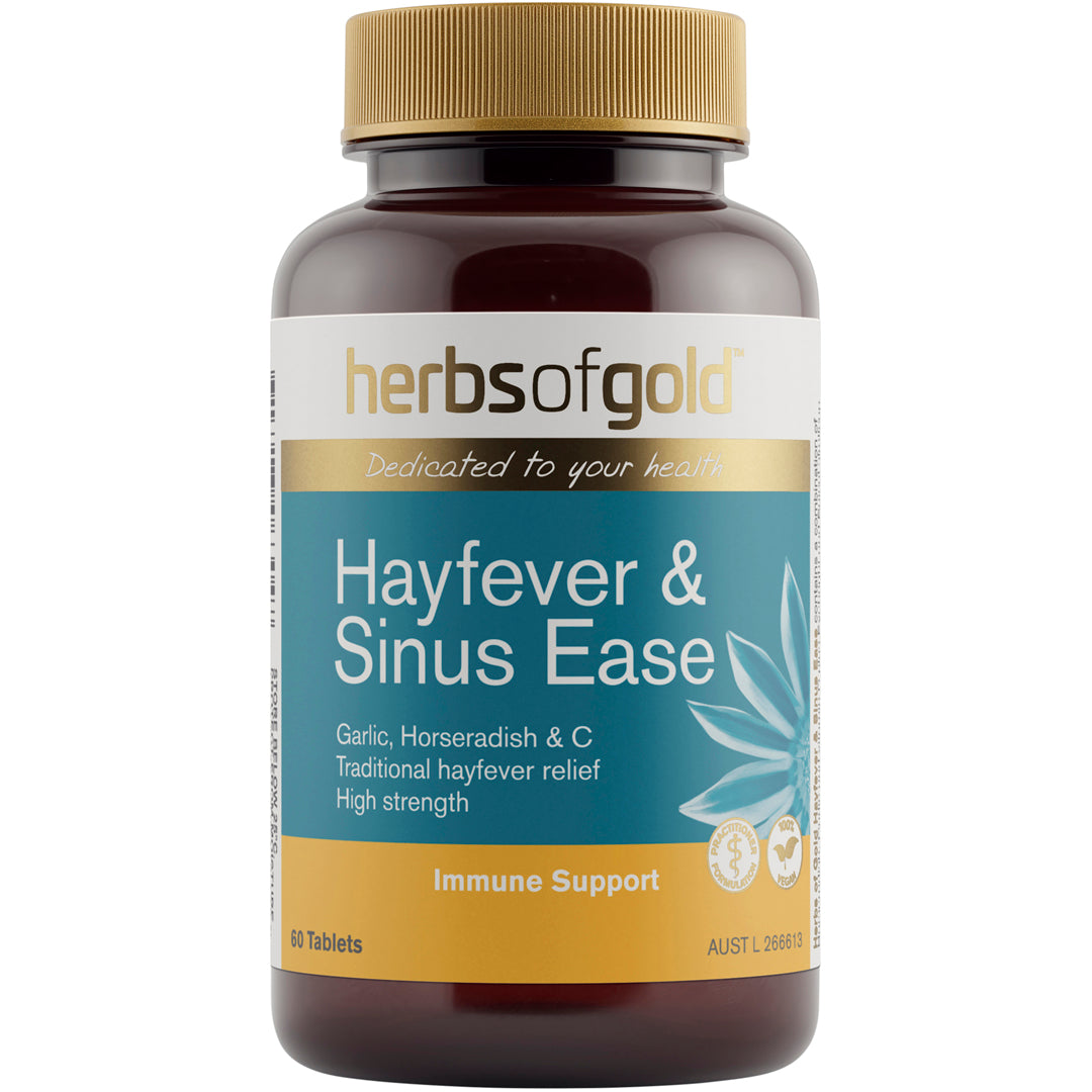 Herbs of Gold Hayfever & Sinus Ease is a comprehensive formula that contains Eyebright, traditionally used in Western herbal medicine to relieve symptoms of hayfever and sinusitis.