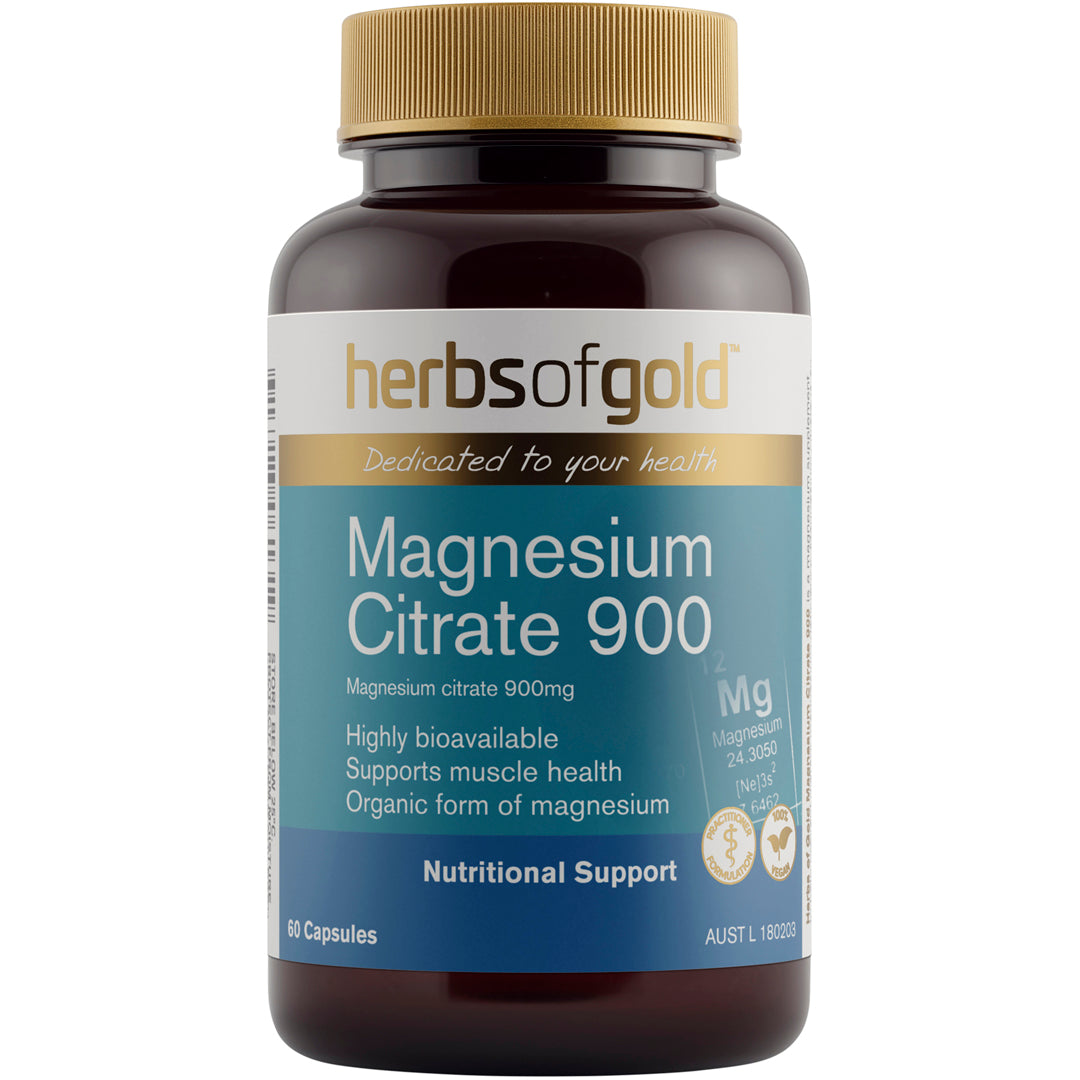 Herbs of Gold Magnesium Citrate 900 provides an organic form of magnesium to maintain healthy muscle contraction function and nervous system health.