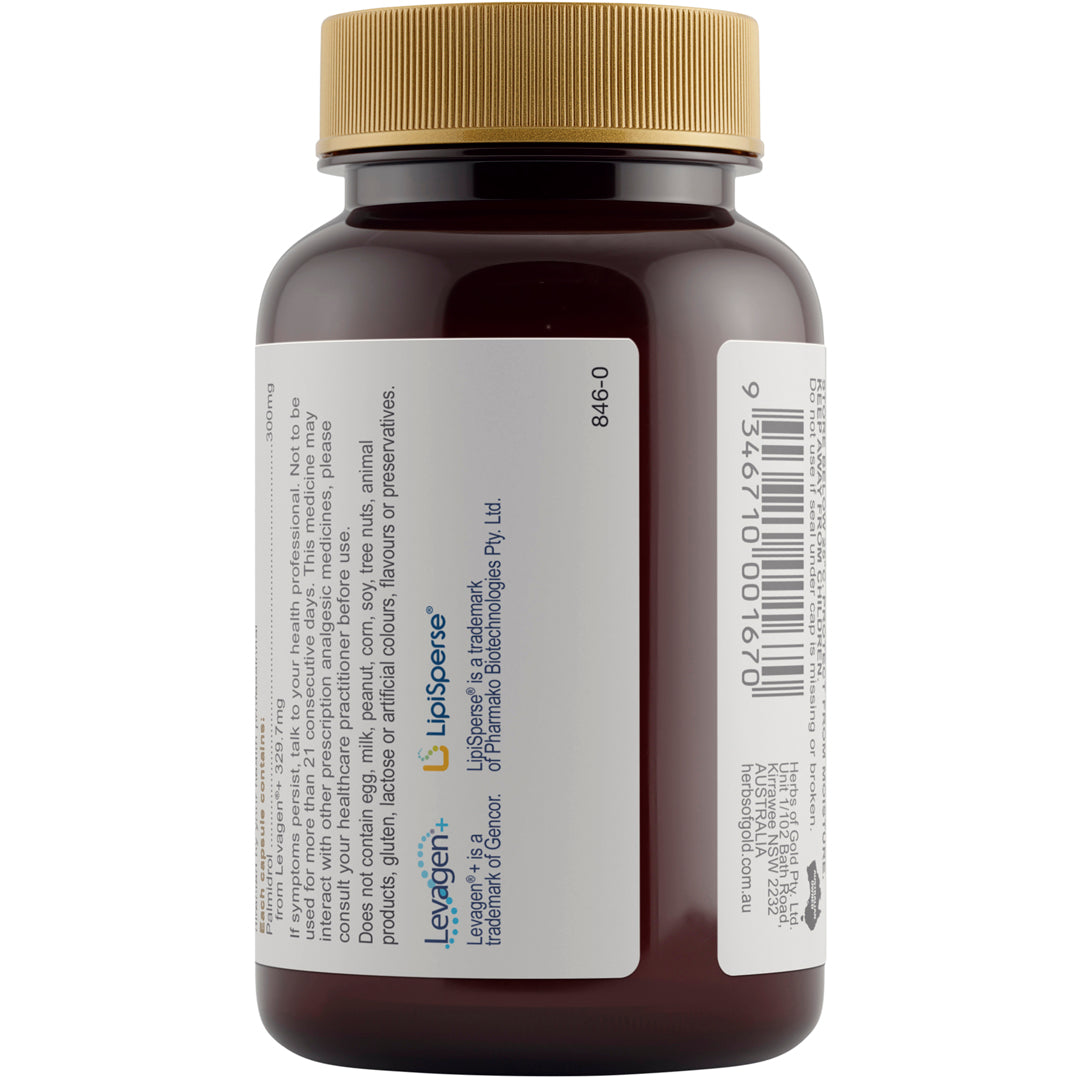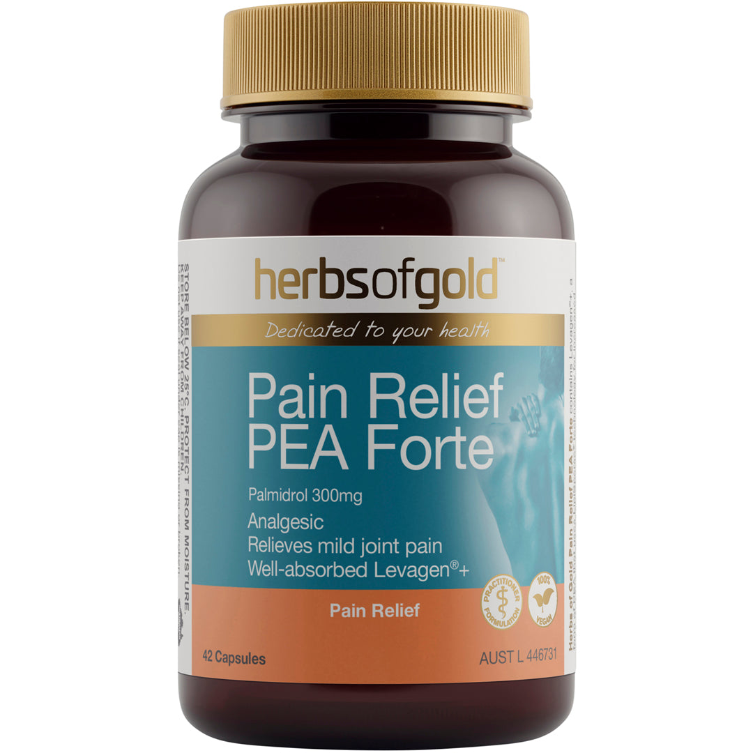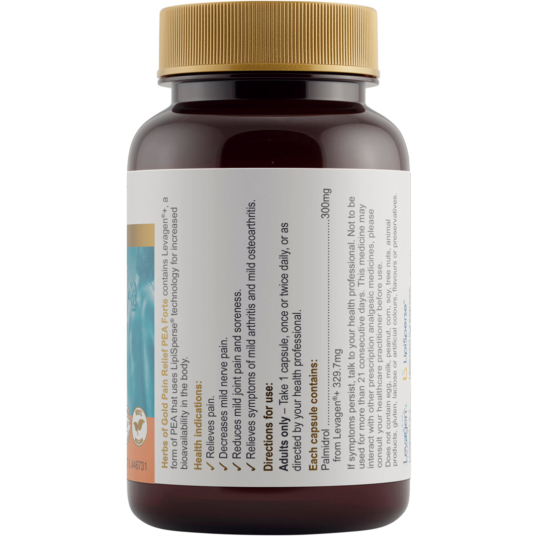 Herbs of Gold Pain Relief PEA Forte contains 300mg of palmitoylethanolamide (PEA), or palmidrol, to relieve pain.