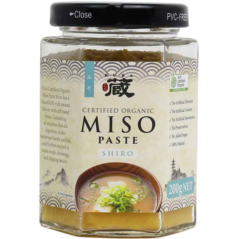 Kura Certified Organic Miso Paste Shiro has a beautifully rich umami flavour with soft sweet tones. Consisting of enzymes that aid digestion, it also tenderised meats and fish, and further enjoyed to make soups, dressings, and dipping sauces.