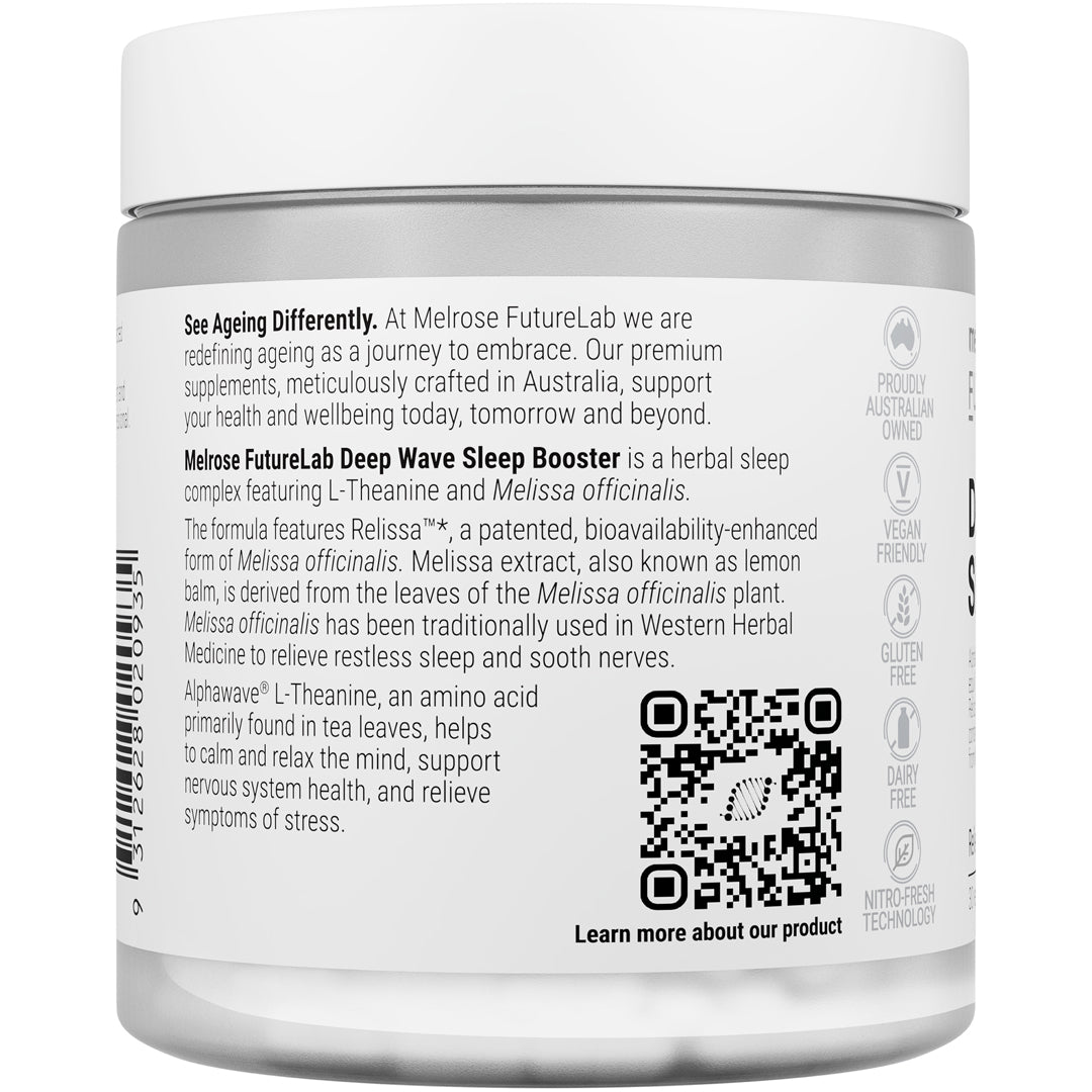 Deep Wave Sleep Booster is a herbal sleep complex featuring L-Theanine and Melissa officinalis. The formula features Relissa™*, a patented, bioavailability-enhanced form of Melissa officinalis. Melissa extract, also known as lemon balm, is derived from the leaves of the Melissa officinalis plant. Melissa officinalis has been traditionally used in Western Herbal Medicine to relieve restless sleep and sooth nerves. Alphawave® L-Theanine, an amino acid primarily found in tea leaves, helps to calm and relax the mind, support nervous system health, and relieve symptoms of stress.