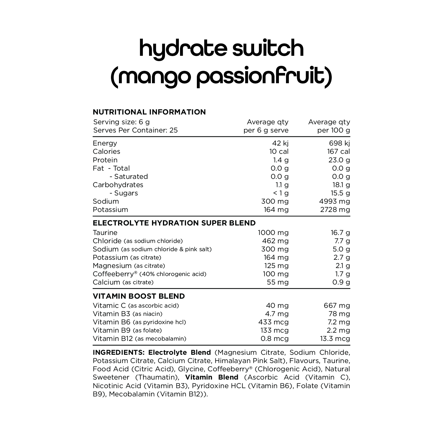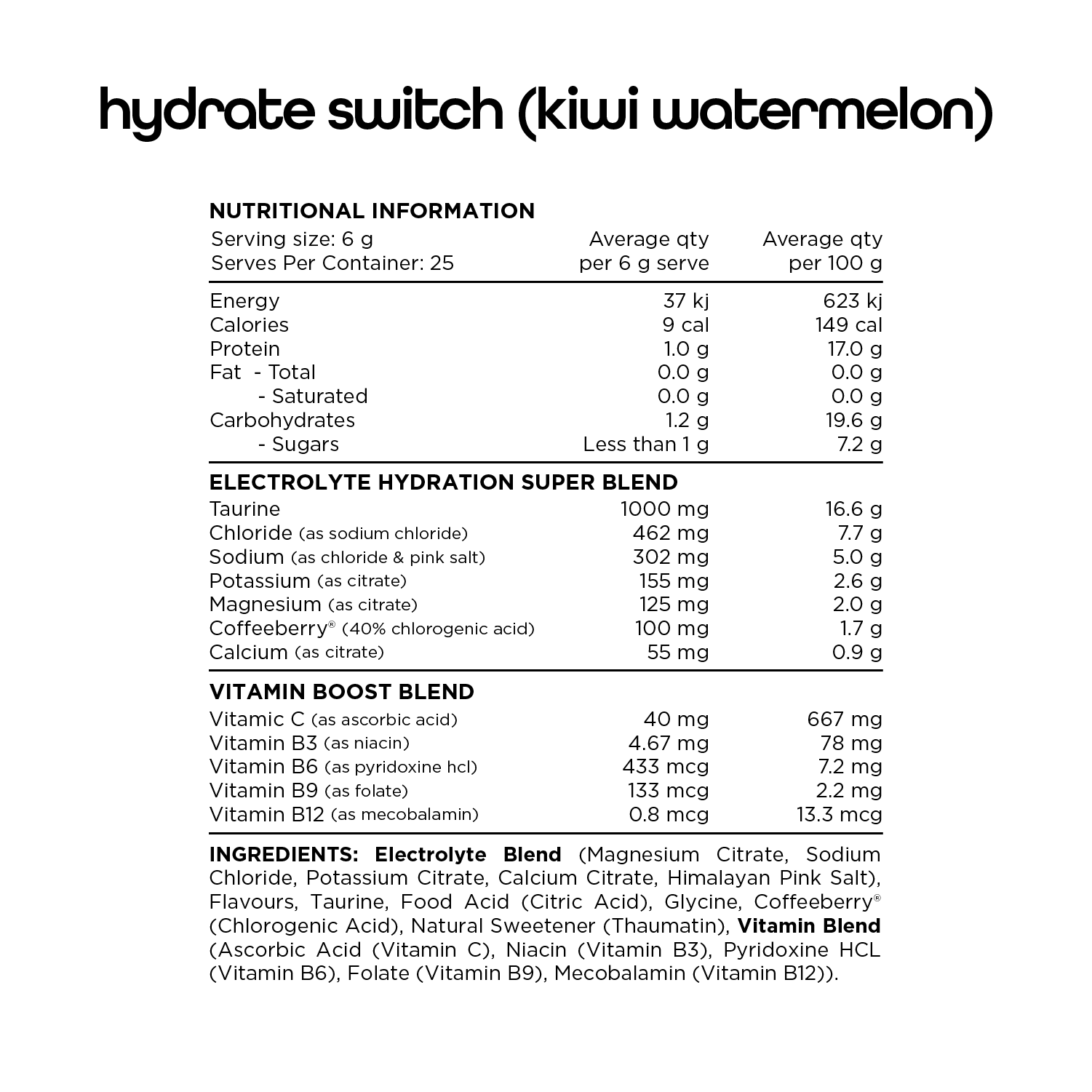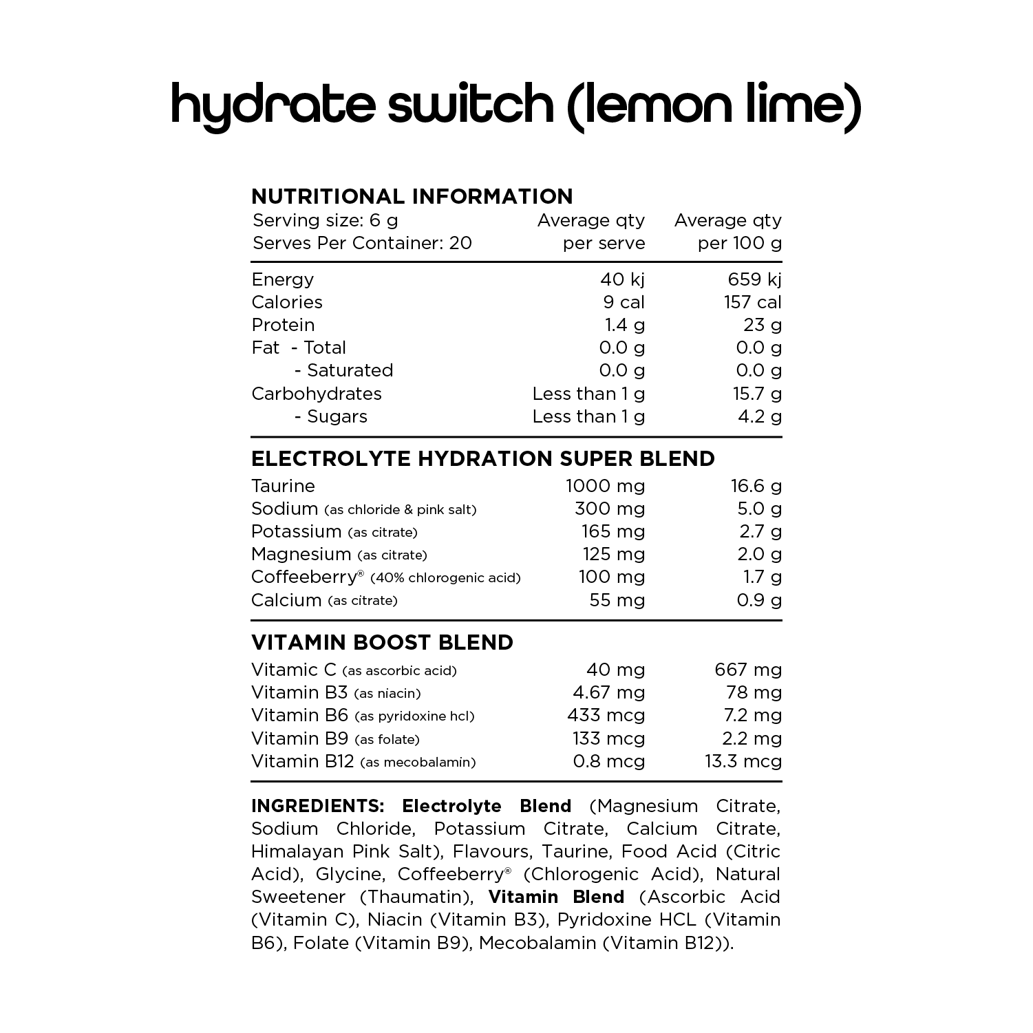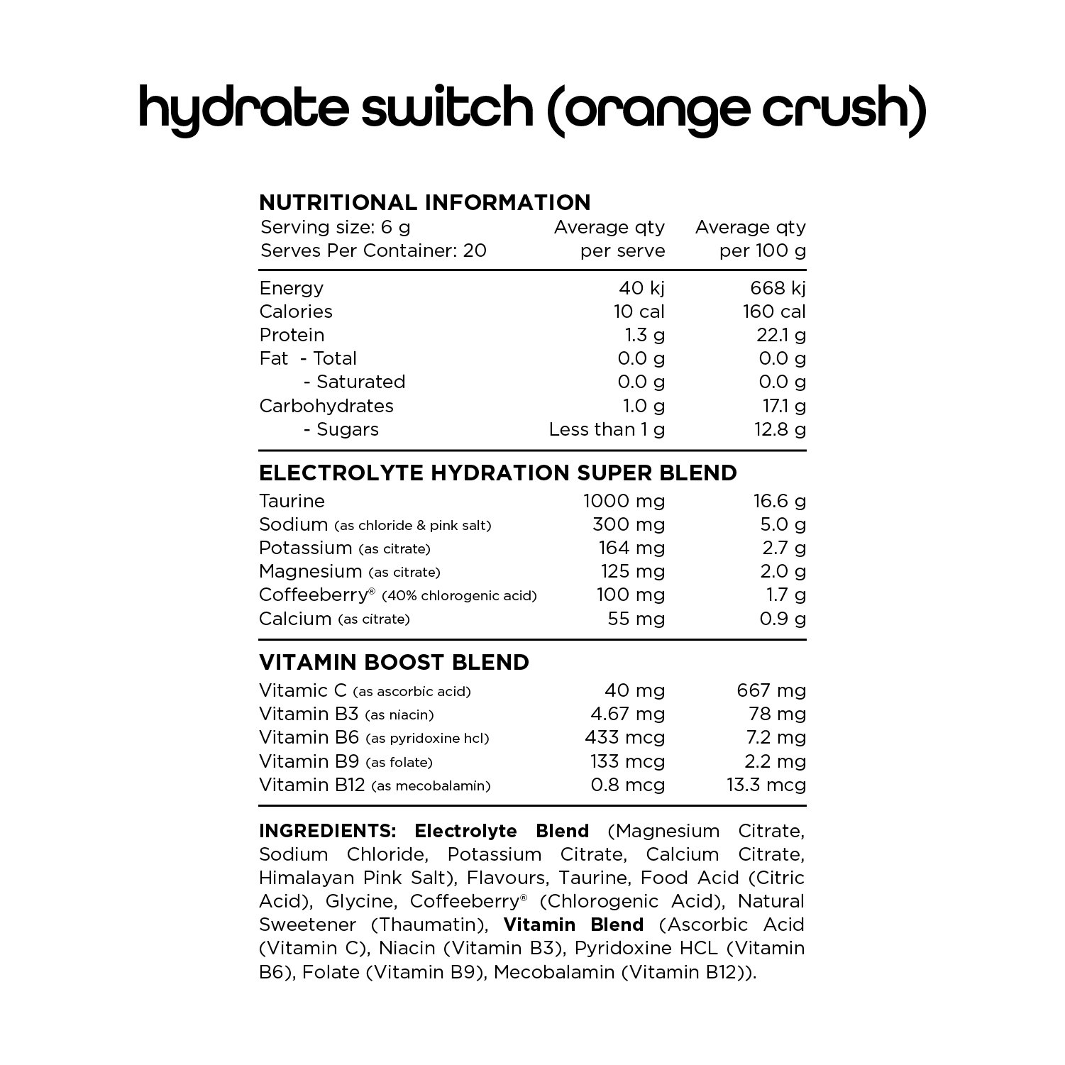Hydrate Switch is the ultimate no added sugar hydration supplement for everyday use. It is designed to supply a scientifically balanced blend of Vitamins, Minerals and Amino Acids to invigorate your body and optimise your daily hydration.