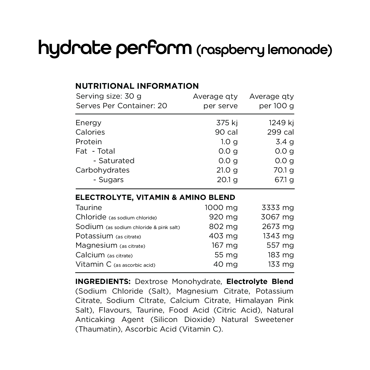 Contains 802 mg of sodium, 403 mg of potassium, and 920 mg of chloride to replenish vital electrolytes lost through sweat. Hydrate Perform helps you maintain optimal hydration, allowing you to push harder for longer during your workouts.